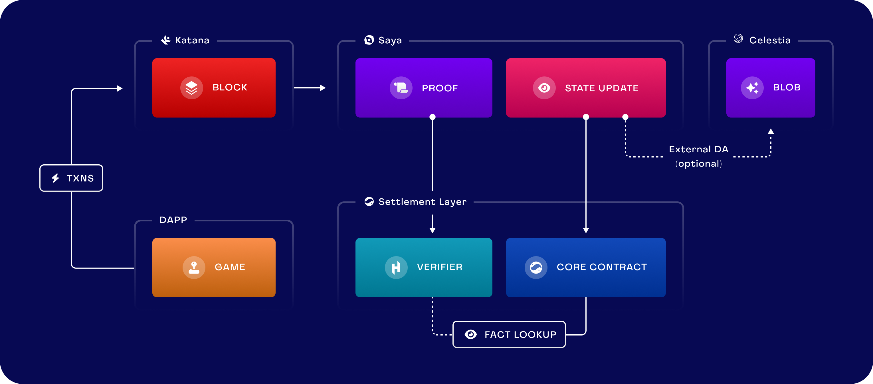 In persistent mode, Saya fetches blocks from Katana, verifies proofs, and updates the core contract state on the settlement layer.